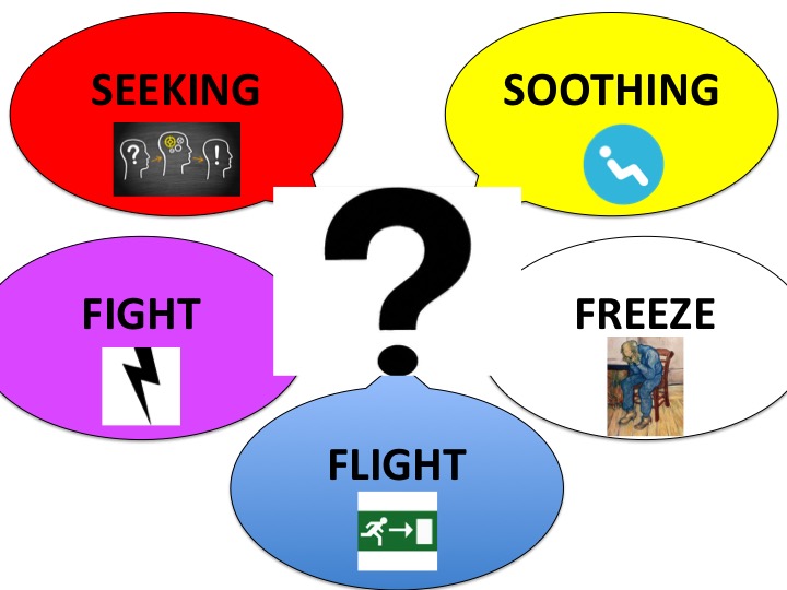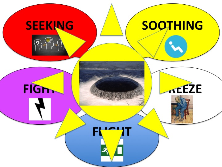 Dia1Nu restte mij de vraag nog: waarheen? Waar moest ik in al die ‘turmoil’ naartoe? Is er een plek, iemand, een ruimte waar ik naar toe kan gaan? Ik had de 5 modi beschreven/getekend als cirkels in de rondte in mijn dagboek. Moest ik mij verdiepen in mindfulness zoals mijn vrouw en mijn therapeut suggereerden? Op de een of andere manier kreeg ik daar geen affiniteit mee. Ik vond het te ‘afstandelijk’, te ‘gedissocieerd'(natuurlijk te kort door de bocht!). 1001004002726626Voor mijn gevoel stond ik er dan teveel naast/tegenover en niet genoeg middenin en te weinig er ‘doorheen‘. Hoe kon ik mij goed verhouden hiermee? Waar ben ik ‘Zelf’ in dit alles? Ik wist dat geen van die 5 stemmingen mijn ware Zelf konden zijn. Daarvoor waren ze of te negatief of te voorbijgaand van aard. Alles gaat voorbij, niets werkt, niets is blijvend. Alles is een voorbijgaande configuratie van situatie, moment, handeling en stemming. Achter alles staat een komma, Maar: