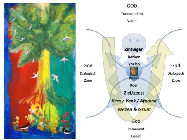 Laat ik beginnen met mijn Godsbeeld. In deze ‘topografie’ probeer ik 4 perspectieven op God in beeld te brengen. Het is vier keer hetzelfde zeggen. God als de scheppende, alles dragende en allesdoordringende liefdevolle werkelijkheid. Hagia Sophia (godheid bij Eckhart?) als oorsprong/bron. De dynamische, kenotische en scheppende werkelijkheid onderling wordt prachtig beschreven door Meister Eckhart: