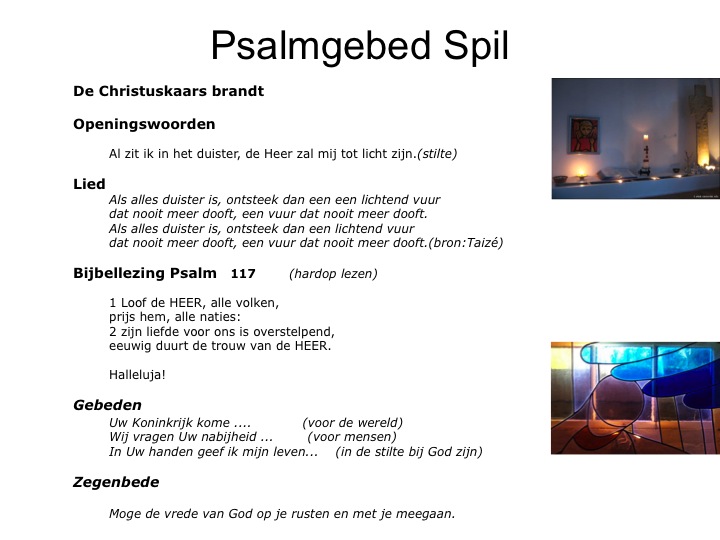 Ik wil je attent maken op een gebedenboek (wachtwoord : ePsalter) wat we met een aantal mensen van de Spil hebben ontwikkeld. Een heel eenvoudige liturgie en in een kwartiertje te doen.